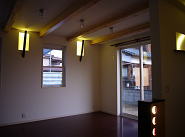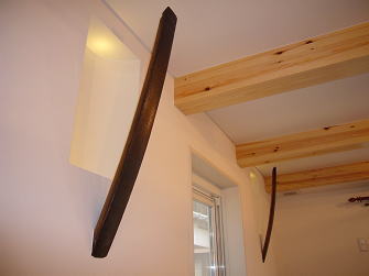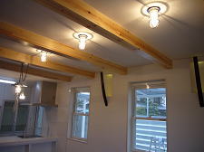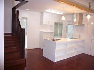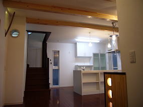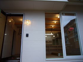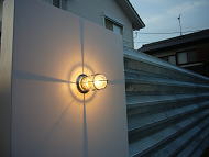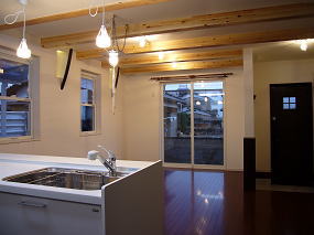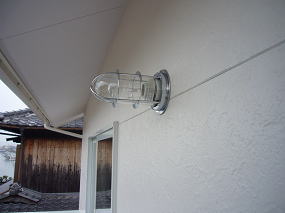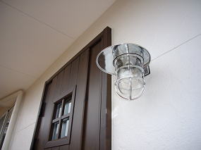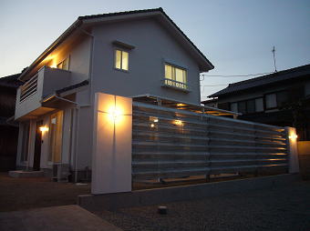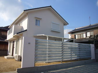 有孔折板という新素材と白を基調とした外観、オープンリビングには船舶照明や樽の木を使った装飾ニッチなど、海辺のカフェを思わせる家が出来ました。